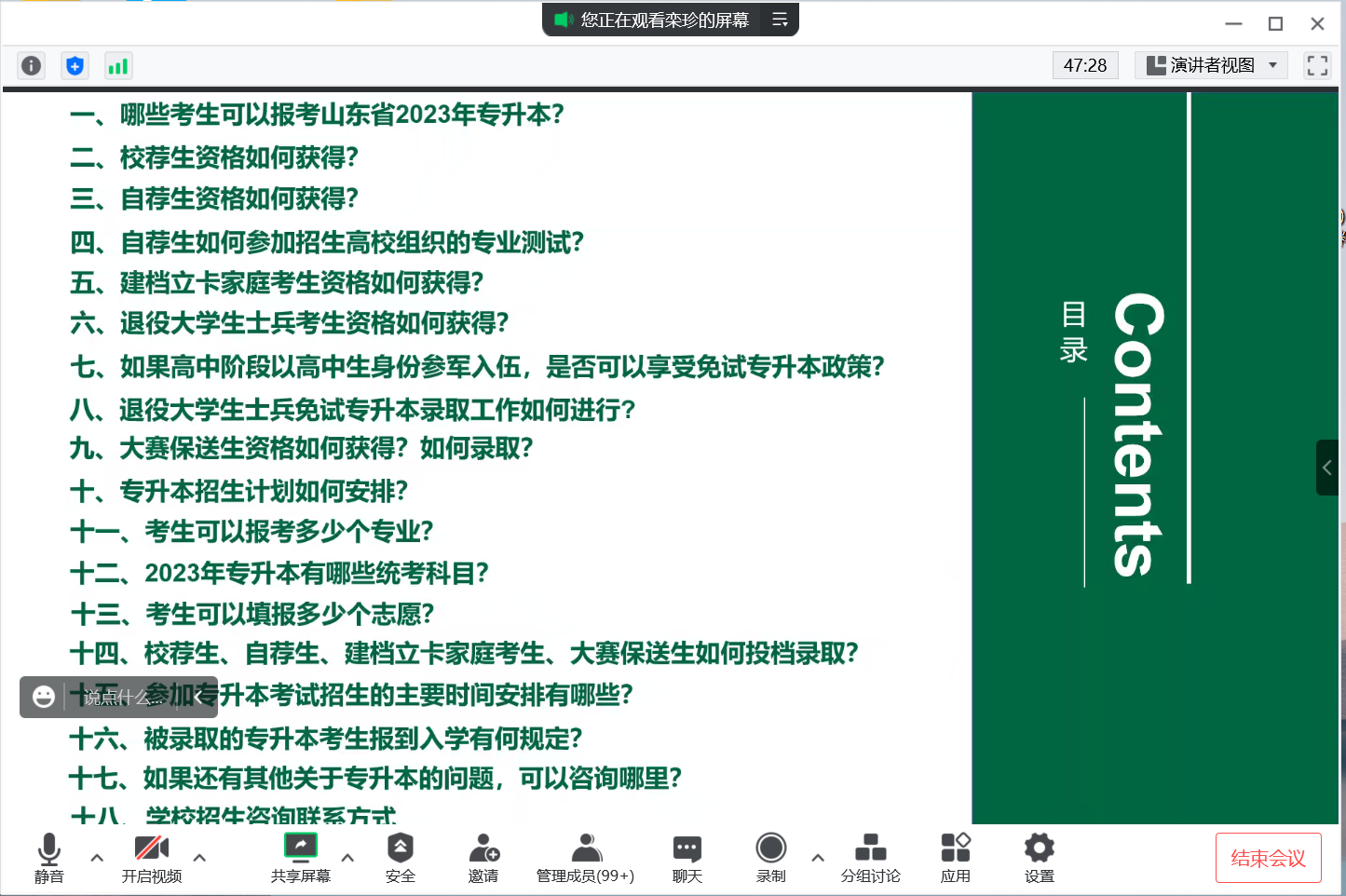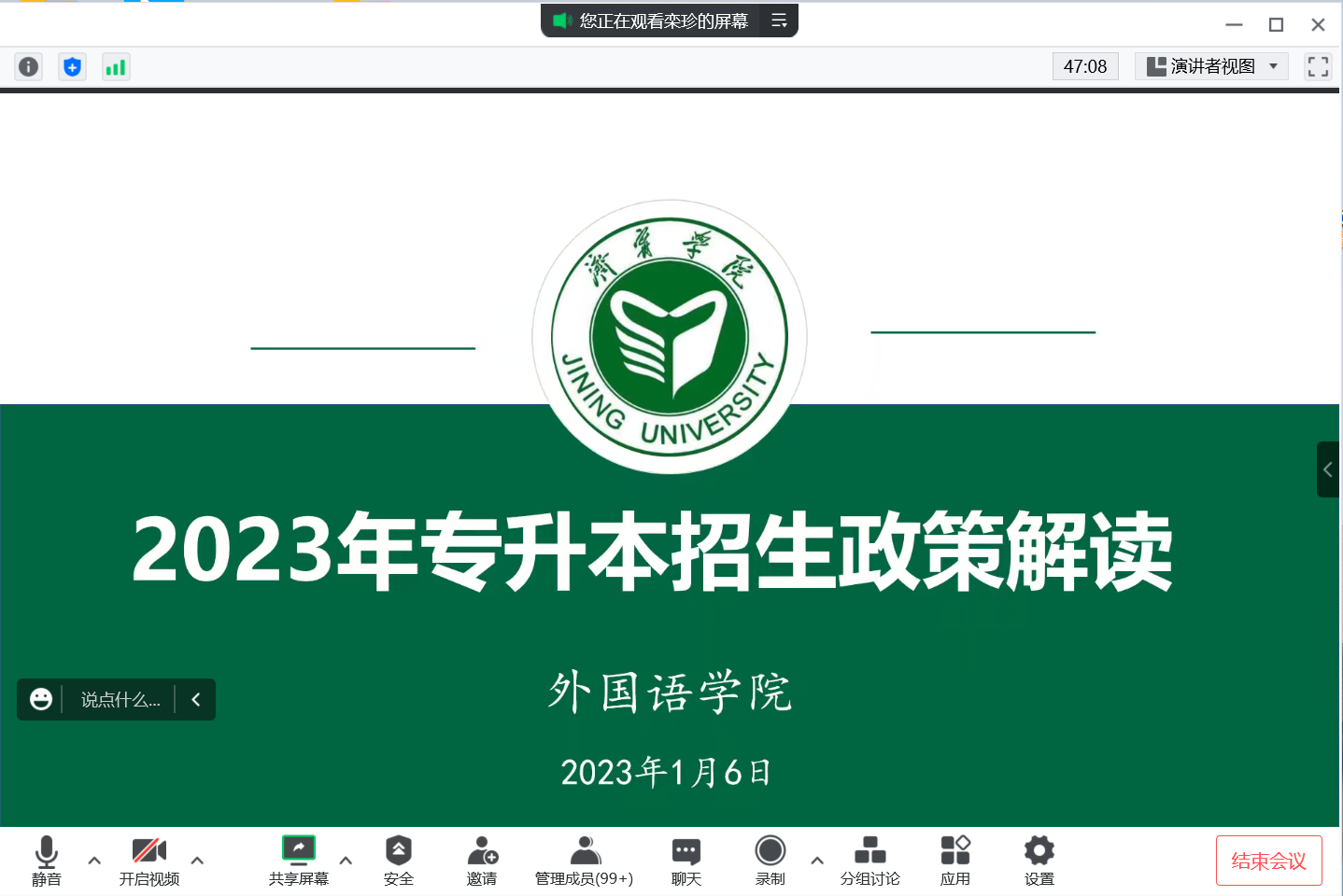 为积极宣传山东省2023年专升本考试招生政策,引导我院英语教育专业应届毕业生积极参加专升本考试,1月6日晚,外国语学院利用腾讯会议召开2023年专升本考试招生政策解读线上会议。外院党委副书记许言强、副院长张颖、教学秘书栾珍、教学助理刘暖及2020级英语教育专业全体同学参加,辅导员田清敏主持会议。
