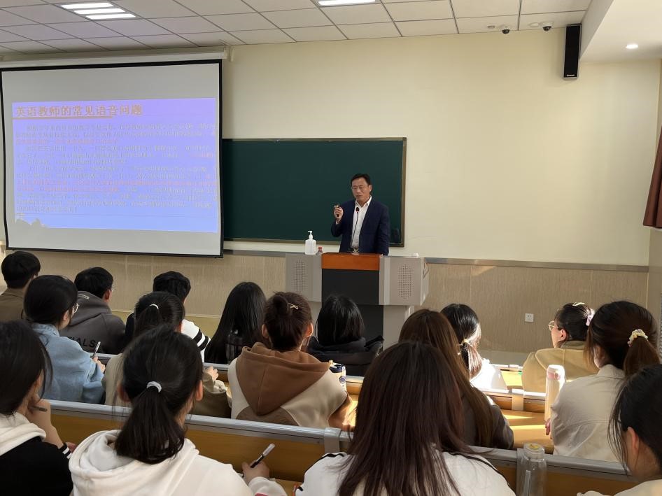 本学期我院将继续稳步推进“名师进课堂”活动的常态化,3月28日下午,曲阜市教师教育发展服务中心教研室副主任陈儒亭老师受邀为我院带来首场讲座“中小学英语教师必备的语音素养”,讲座由外国语学院党委副书记文灿主持,2021级、2022级本、专科全体师范生聆听了本次讲座。