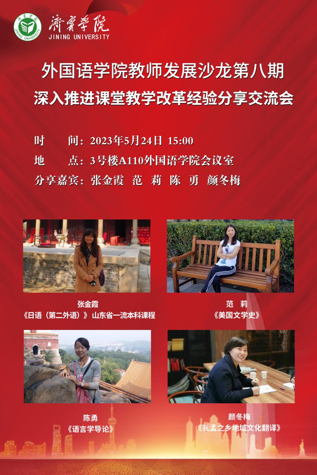 5月24日下午,外国语学院在3号楼A110举办教师发展沙龙第八期活动暨深入推进课堂教学改革经验分享交流会。张金霞、范莉、陈勇、颜冬梅四位课程团队负责人作为分享嘉宾,汇报交流了各自课程的课堂教学改革现状,外院全体教职工参加了此次分享交流活动,活动由副院长张颖主持。