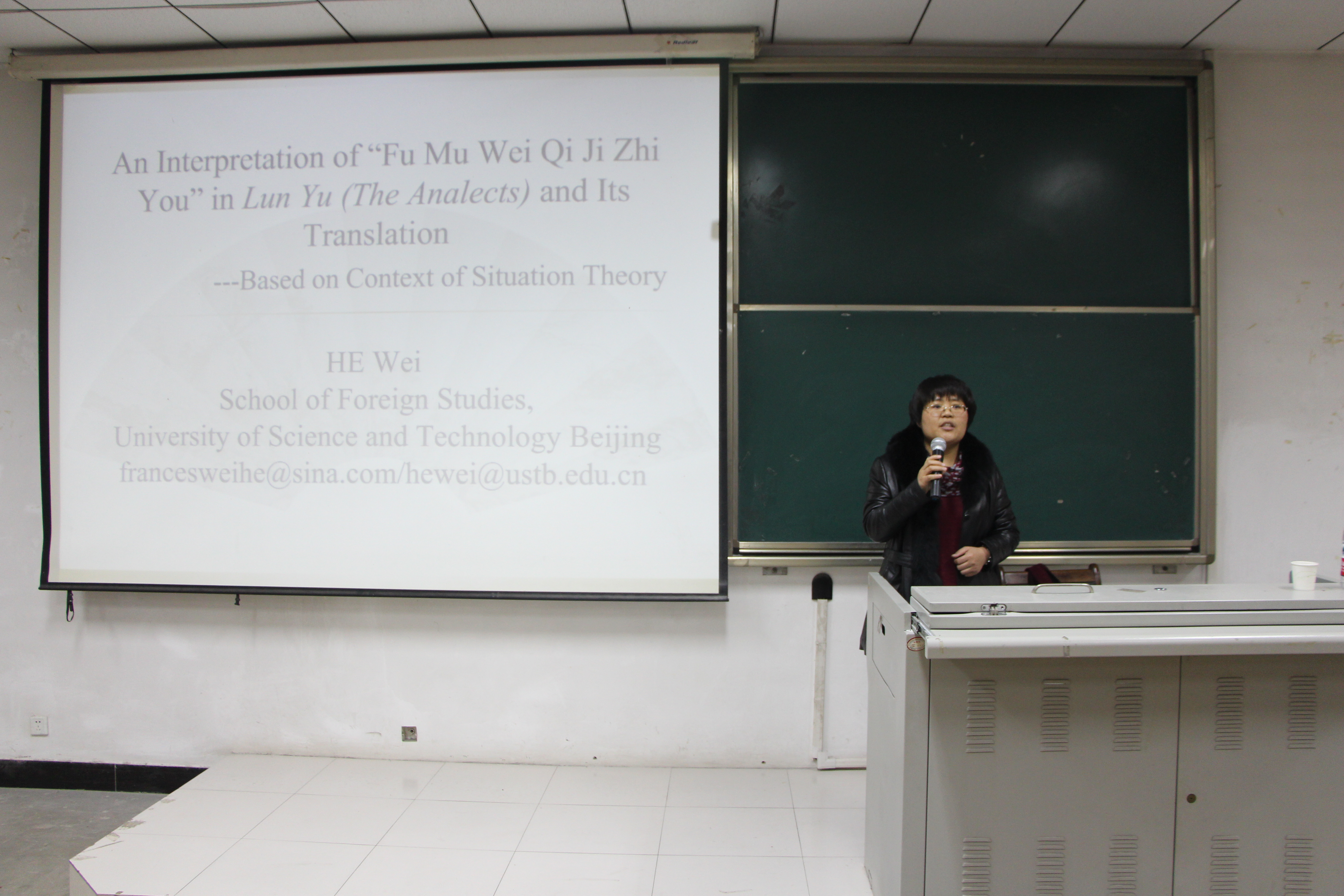 2014年12月10日晚7点至9点,北京科技大学外国语学院副院长、博士生导师何伟教授应外国语系邀请,在外语楼C201为全校师生做了题为“《论语》疑难章句翻译研究”的学术报告。讲座由外国语系主任杨楠主持。