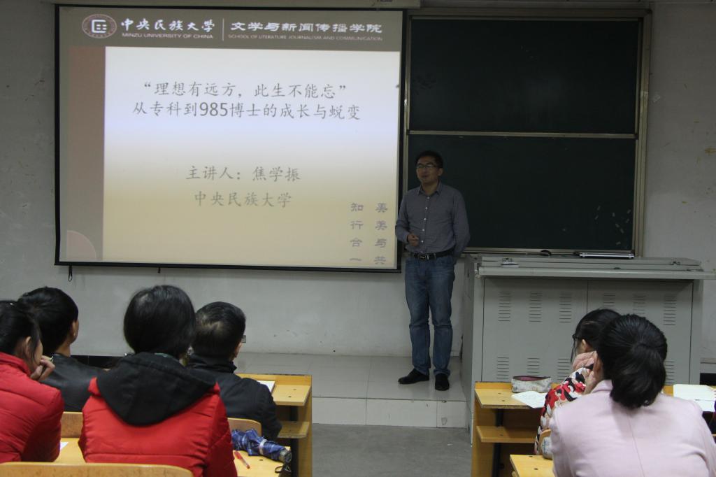 2016年11月7日18:40-20:40,我系邀请2012届优秀毕业生焦学振(现为中央民族大学文学与新闻传播学院博士生),在外国语系C201多媒体教室为全系师生做了题为“理想有远方,此生不能忘”的讲座。