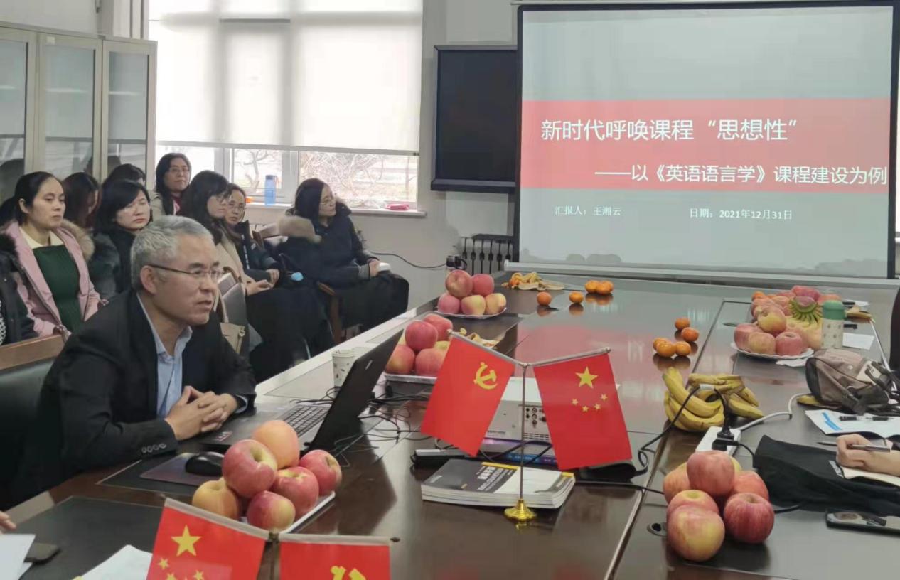 12月31日下午,外国语学院教师专业发展沙龙第四期在3号楼A110会议室顺利举办。恰值岁末,外国语学院藉此次活动举办了建院以来的第一次教师联欢会。与会教师纷纷通过诗歌朗诵、歌曲弹唱等才艺形式表达了对于外国语学院这一成长共同体的期许,也传递了在进入新时代后对外国语学院学科专业及个人发展的良愿。之后,在窗外冬意盛、窗内暖意浓的氛围中,山东大学王湘云教授应邀为全院教师做了题为“新时代呼唤课程思政性——以《英语语言学》课程建设为例”的学术讲座,并就新文科建设、学术研究和教师发展等话题与部分骨干和青年教师进行了深入交流。本次讲座与座谈由外国语学院院长杨楠教授主持。