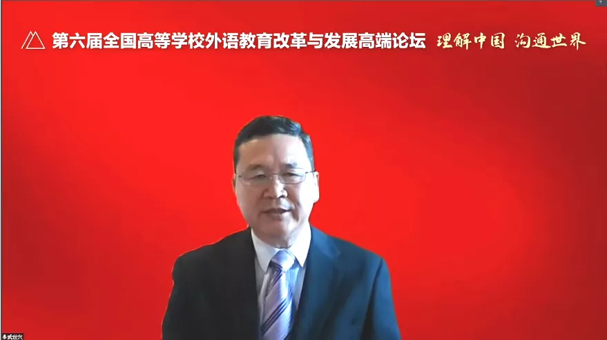19日上午的主旨报告由中宣部国际传播局陈雪亮副局长、教育部高等教育司武世兴副司长、中国原驻英国大使查培新、北京外国语大学党委书记王定华教授、教育部高等学校教学信息化与教学方法创新指导委员会主任委员、武汉理工大学校长杨宗凯教授分别作主旨发言。各位专家高远站位把舵领航,以多元视角拓宽视野,指导中国高等外语教育开拓前行。