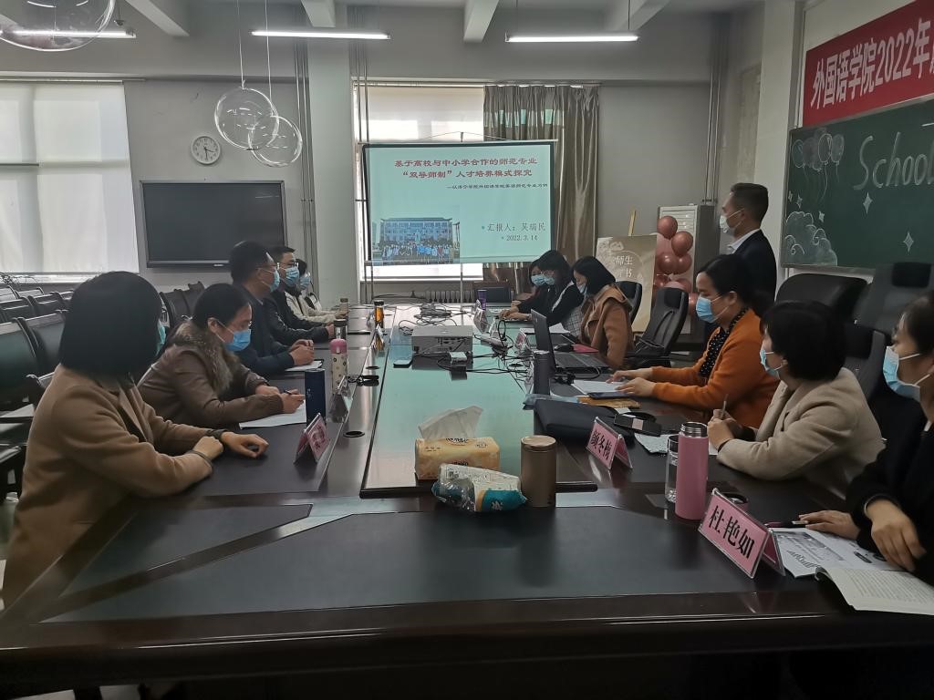 为进一步提高教改项目完成质量,促进真题真做,2022年3月14日下午,外国语学院在3号楼A108会议室开展了2021年校级教改及课程思政示范课立项课题开题论证会。本次活动由外国语学院副院长张殿海主持,各教改项目负责人及其他相关教师参会。活动邀请了学校教学质量监控与评估处副处长王朝杰、外国语学院教师戴静、张素珍、刘晶作为指导专家参加本次活动。