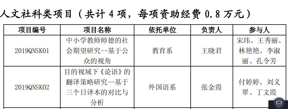 济宁学院2019年度科研基金项目评审结果公布,根据《济宁学院科研基金管理办法》(济院政字〔2016〕47号)的规定,经个人申报,系(院、部)推荐,校评审委员会评审,校学术委员会审核,确定 9 个项目为济宁学院 2019 年度青年科研基金项目,其中我系张金霞老师主持的人文社科类项目“目的视域下《论语》的翻译策略研究--基于三个日译本的对比与分析”顺利获批立项,项目编号2019QNSK02。