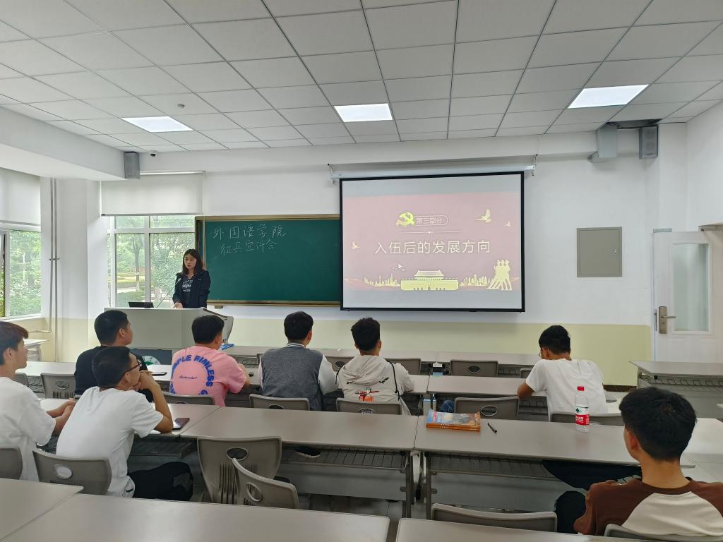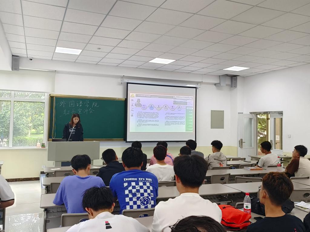 为加强征兵政策宣传,激发大学生参军入伍热情,进一步做好2023届毕业生应征入伍工作,5月29日下午,外国语学院在3A101教室邀请2020级英语教育退役大学生士兵翟传鑫同学开展征兵工作宣讲。外国语学院辅导员田清敏、冯占磊以及有意向入伍的同学参加会议。