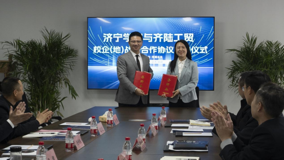 ▲张颖代表学校与山东齐陆工贸有限公司董事长苏杭签订合作协议