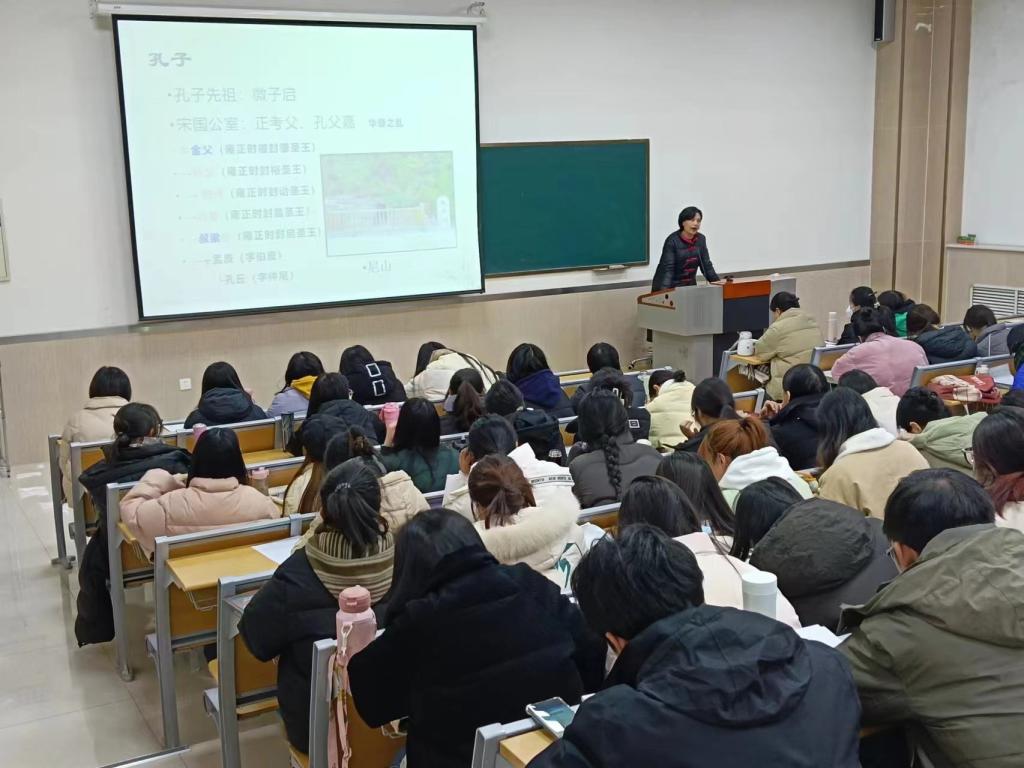 李学欣老师从曲阜作为中华文明的重要发祥地讲起,梳理了曲阜作为黄帝生地、少昊之墟、鲁国故都的文化渊源,阐述了鲁文化的“孝悌忠信”和齐文化的“礼义廉耻”,讲述了周公的制礼作乐对儒家文化的影响,进而阐述了儒行天下的历程。从孔子的成长历程让学生认识到读书的重要性;从周公庙里“金人铭”的解读告诫学生“谨言慎行”的立世哲理;从孔子与众弟子的关系中让学生感悟到新时代的师生关系。报告的最后,李学欣老师带领同学们“云游”孔庙,用专业的导游知识让学生对孔庙的重要景点有了全新的认知。