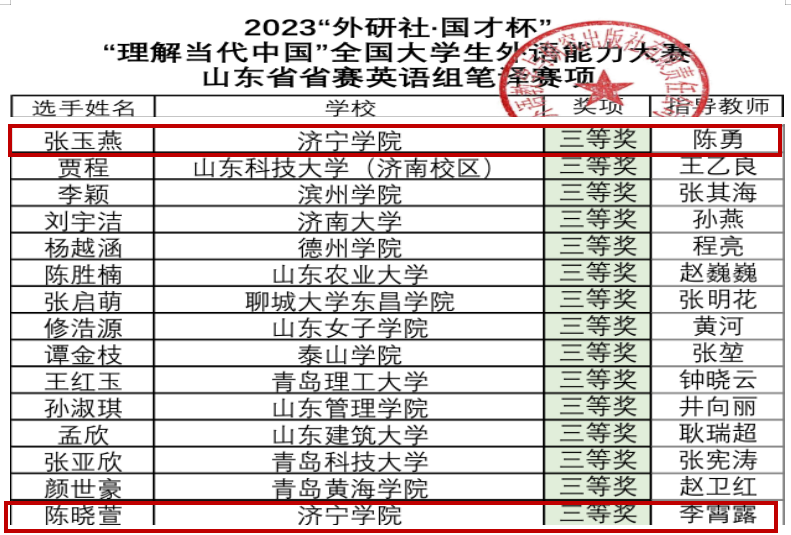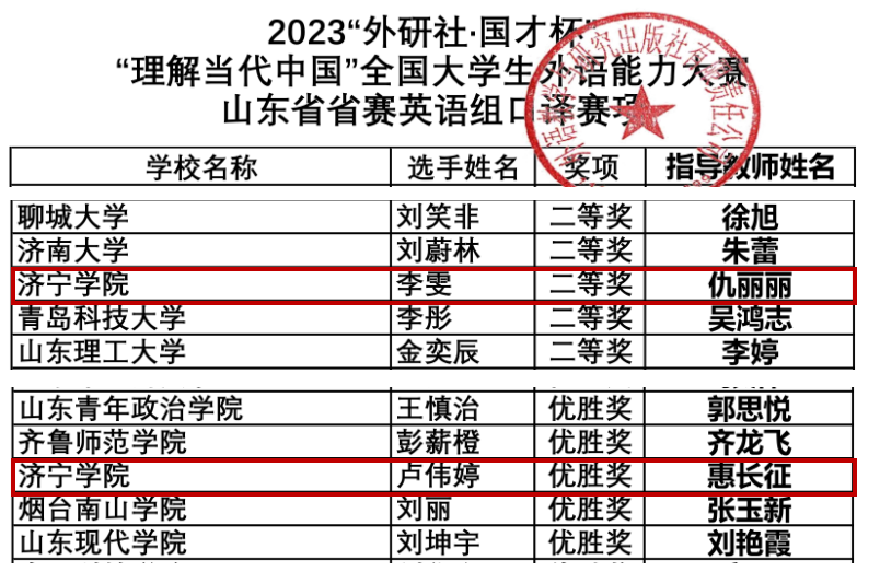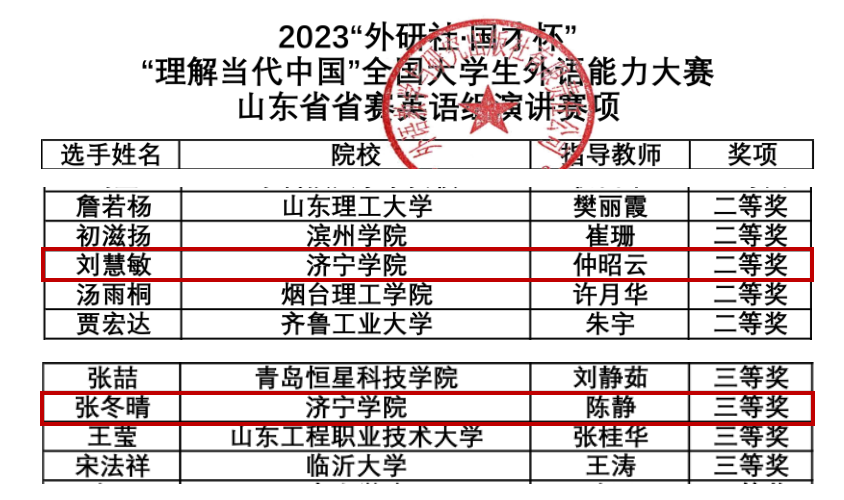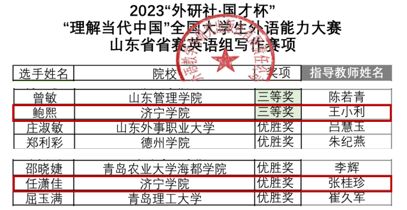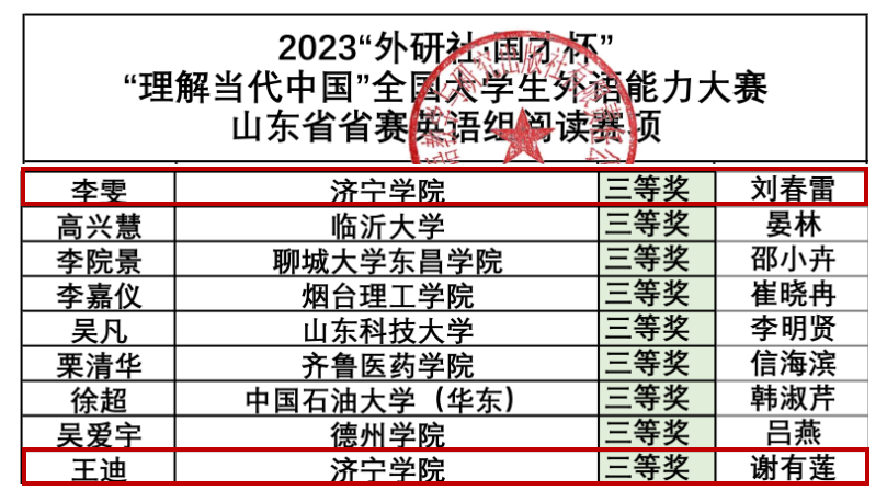 近日,2023“外研社·国才杯”“理解当代中国”全国大学生外语能力大赛山东省省赛在山东大学落下帷幕。外国语学院选出9名同学参加省赛,分别获得二等奖2项、三等奖6项,优胜奖2项。