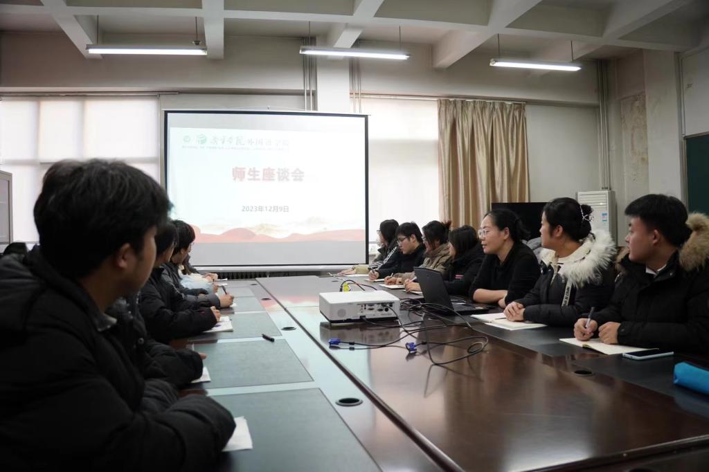 2023年12月9日下午,赢博足球师生座谈会于外国语学院一楼会议室内召开,团委副书记姜璨和全体外国语学院的学生参加。