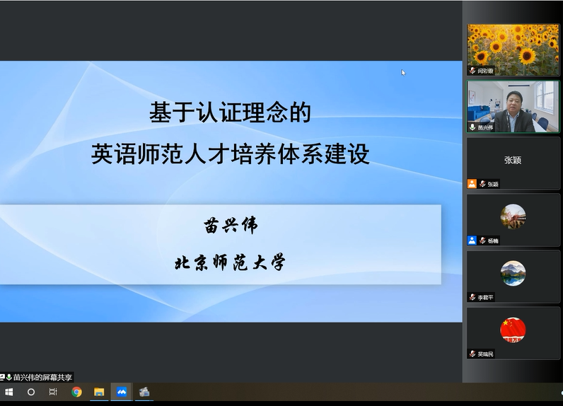 3月26日晚,外国语学院邀请北京师范大学外文学院院长苗兴伟教授作了题为“基于认证理念的英语师范人才培养体系建设”的讲座。因疫情缘故,本次讲座借助腾讯会议采取了线上讲座的形式。讲座由院长杨楠主持,外院全体教职工参加了本次讲座。