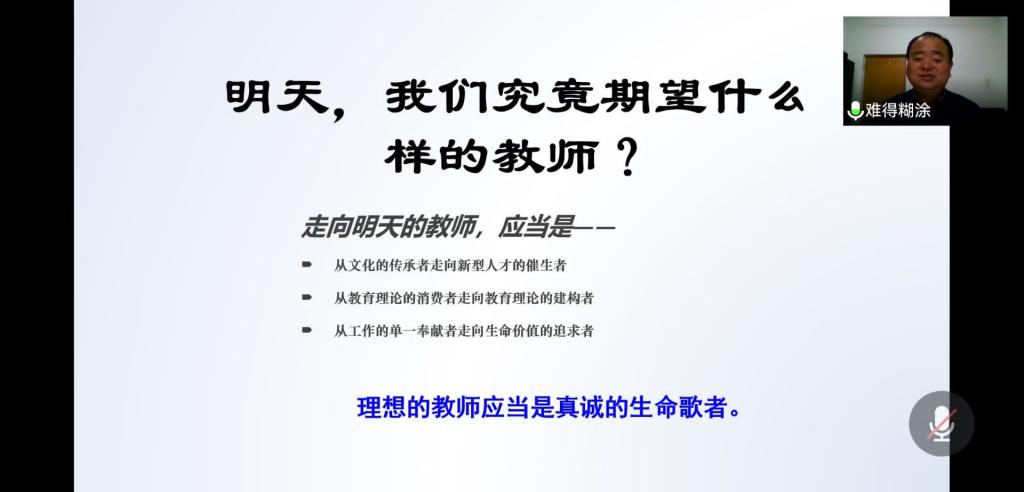 2021年11月18日晚,外国语学院邀请曲阜市教师教育发展服务中心宋玉忠老师于腾讯会议线上为我院师生作了题为“走专业化之路,体验职业的幸福与快乐---教师职业发展前景解析”的讲座。外国语学院英语师范生教师教育导师团、2019级、2020级和2021级英语师范专业学生80余人参加了此次活动。