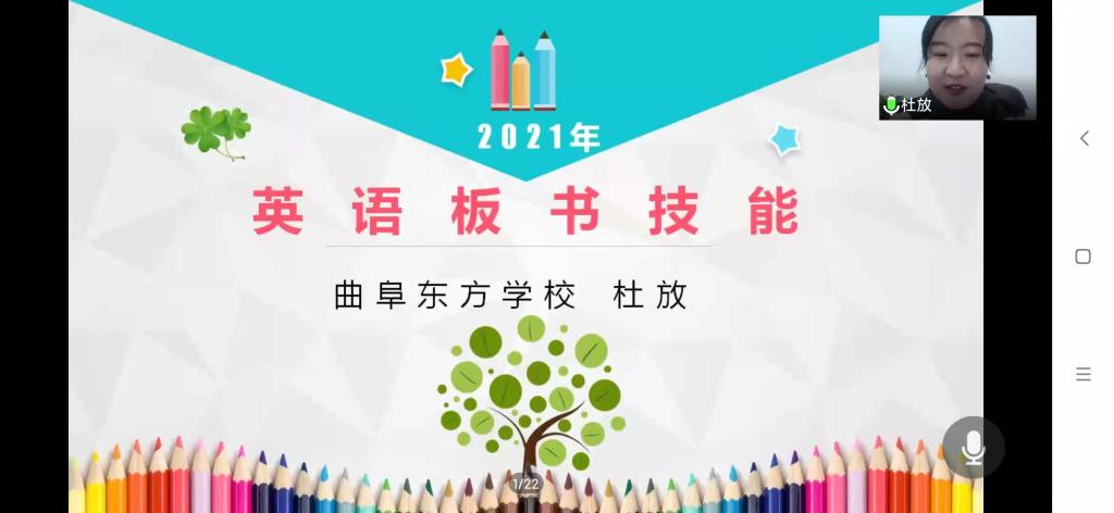 2021年11月25日晚,我院名师进课堂活动邀请到了曲阜东方学校副校长杜放为外院师生作了题为“英语教学之英语板书技能”的讲座。因疫情缘故,本次讲座借助腾讯会议采取了线上课堂的形式。讲座由我院教学秘书刘春雷主持,英语师范生教师教育导师团以及2019级、2020级英语师范专业学生180余人聆听了本次讲座。