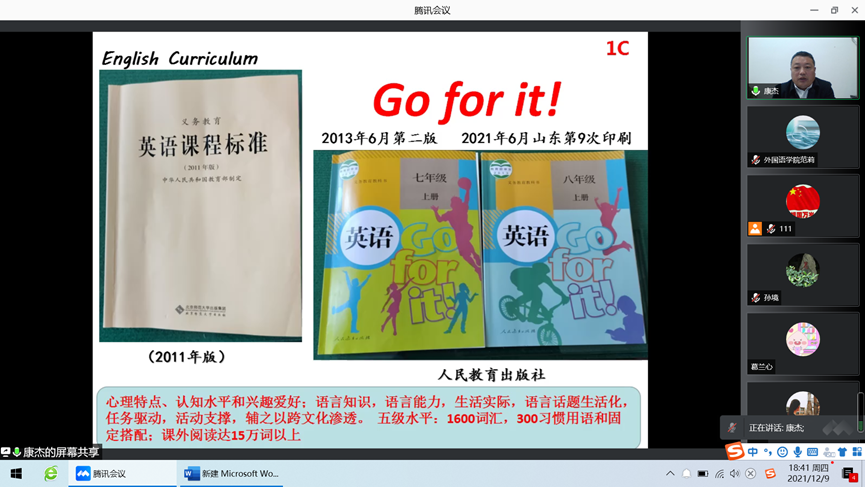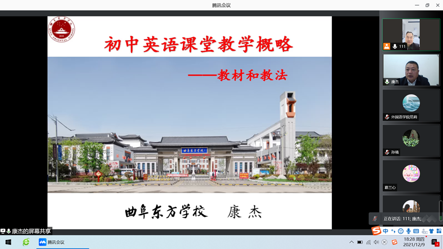 为进一步提高师范生教育教学技能,促进理论教学与实践教学的有机融合,2021年12月9日晚,我院名师进课堂活动邀请到了曲阜东方学校副校长康杰为外院师生做了题为“初中英语课堂教学概略---教材和教法”的讲座。因疫情缘故,本次讲座通过腾讯会议采取了线上课堂的形式。讲座由我院英语专业师范方向负责人吴瑞民主持,英语师范生教师教育导师团,2019级公费师范生和2021级英语专升本(师范方向)学生,共计150余人聆听了本次讲座。