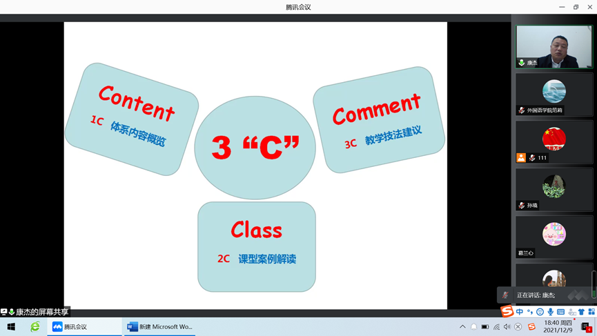 康校长从教材和教法两个维度出发,以英语课堂教学的3“C”(Content, Class, Comment)为主线,围绕英语课程标准,基于现行英语教材,结合自身教学经验,为同学们带来了一场深入浅出的报告。