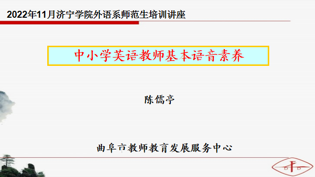 11月18日,曲阜市教学研究室副主任陈儒亭做了题为“中小学英语教师必备的语音素养”的讲座。陈老师从列举中小学英语教师常见的语音错误入手,阐述了正确发音的重要性,然后结合实例详细讲解了英语语音基础常识,分享了大量的儿歌和发音口诀,展示了许多经典作品。陈老师的讲座声情并茂,讲练结合,示范准确到位,非常精彩。